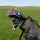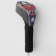 Diese Kopfabdeckung ist mit einem Logo im Retro-Stil versehen, das einen Golf-Tee mit Ball, Fahnen, Clubs und Stars enthält. Die verwendeten Farben sind grau-blau, weiß und gold. Über dem Logo ist ein rotes Banner mit Ihrem Namen. Ein weißer Stern am unteren Ende vervollständigt das Design, und alles wird auf einem marineblau blauen Hintergrund platziert.
