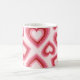 This is a seamless, retro-style heart pattern featuring layered heart shapes in various shades of red and pink. Each heart has a bold, concentric design that creates a 70s-inspired aesthetic, with a light pink background adding a soft, romantic touch. Scattered small white stars add sparkle and visual interest, enhancing the playful and vibrant mood of the design.