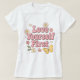 A soft pink 70s-inspired illustration featuring the phrase “Love Yourself First” in curvy retro bubble letters with white highlights and a clean dark outline. Surrounded by pastel flowers, gentle green leaves, a yellow butterfly, and subtle sparkles, this cheerful vintage-style design spreads self-love and positivity. Perfectly balanced, smooth, and high-resolution, ideal for stylish prints and apparel.