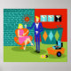Dieses Retro Martini Couple Poster sieht aus wie eine Szene aus einer romantischen Komödie. Das minimalistische Design dieses modernen Hauses oder Apartments im Stil der 60er Jahre ist elegant dekoriert und bietet eine moderne Unterkunft im Zentrum des Jahrhunderts. Die Besetzung ist ein attraktives Paar, das einen Abend mit glitzerndem Gespräch, guter Musik und bodenlosen Getränken genießt. Der Raum ist mit einem grünen Boden, einem Aqua- und aquamarinen Ziegelmauer ausgestattet. Eine schöne Frau, die sich bequem in einem Mod, Orangen-Ei-Stuhl ausruhen kann. Ihr knallrosa Kleid ist gerade kurz genug, um ihre formschönen Schinken zu zeigen. Mit der Handwelle hat diese blonde Schönheit die unmittelbare Aufmerksamkeit ihres männlichen Bewunderers. Ihre messe-haarige Begleiterin trägt einen blauen Anzug, weißes Shirt und schwarze Bogen Krawatte. In seinen Händen hält er zwei Kristallbrillen mit schwimmenden Oliven. Mach dir keine Sorgen. Er bietet seiner Freundin eine an. Das Paar hat so eine wunderbare Zeit, dass keines der beiden die Stunde beachtet, die auf der Kätzchen-, Rot-, Sternexplosion-Uhr auf der Ziegelwand hinter ihnen zu sehen ist. An einer vergoldeten, feuerroten Wand befinden sich drei klassische Leinwand-Stretchdrucke von Classic Movie Martini, die auch im StrangeLittleOnion's Zazzle Store erhältlich sind (Tipp, Tipp!) Zwei der Drucke sind mit türkisfarbenem Hintergrund und einer mit einem dramatischen schwarzen Hintergrund versehen. Unter den Drucken zentriert ist ein elegantes nasses Bar. Die Vorderseite des aquamarinen Bar besteht aus drei harlequin-Diamanten in Orangetönen, Türkis und Grün. Wir können die Silhouetten der Martini-Brille sehen, die auf der Theke oben ruhen. Ein orangefarbener Ottoman hält im ganzen Raum einen blauen und schwarzen, tragbaren Plattenspieler. Auf dem Boden sehen wir die Vinyl-Platten und ein hellgelbes Albumcover. Dieses ansprechende Duo hat so eine wunderbare Zeit, dass keiner von beiden auf die Stunde, die auf der kitschigen, roten, Sternexplosion-Uhr auf der Backsteinwand hinter ihnen zeigt, aufmerksam macht.