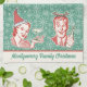 Feiern Sie Weihnachten im Retro-Stil der 50er Jahre mit diesem hübschen Küchentuch. Das Design umfasst eine Vintag aussehende Frau, die eine Weihnachtsmannmütze trägt und ein Martini-Glas hält, und einen Mann, der einen Rentier-Antler-Hut trägt und eine Champagnerflasche hält. Der Hintergrund ist mit Schneeflocken aquamarin. Verwenden Sie die einfache Vorlage, um Ihren Namen am unteren Rand des Handtuchs zu personalisieren. Das Design erscheint zweimal (auf der Vorderseite des Handtuches), sodass es mit jeder Kante nach außen zeigt, wenn es in der Mitte auf einer Küche oder Handtuchständer aufgehängt wird. Genießen Sie die passenden Urlaubsangebote hier: https://www.zazzle.com/christmas_party_retro_midcentury_winter_xmas_humor_invitation-256399088616443134