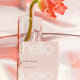 Eine Vintage Visitenkarte mit dem Wort "hallo" und einem individuellen Namen auf pfirsichfarbenem Hintergrund. Hinter dem Design stehen individuelle Name, Titel und Kontaktinformationen