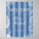 Seaside on the beach fun striped navy blue and white playful unique wedding welcome sign printable poster featuring hand drawn starfish and ocean corals, and a chic whimsical handwritten calligraphy script. +++++++ All colors are editable. +++++++++ Suitable for retro casual trendy beach coastal summer destination weddings.