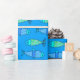 Mitte des Jahrhunderts Modernes, skurriles, Retro-Fischmuster, das Papier, türkis, aqua, kalk- grün und himmelblau, auf einem tiefen, kerulenblauen Hintergrund umhüllt