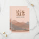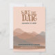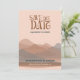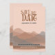 Diese Save the Date Karte ist ideal für eine Hochzeit in Urlaubsort in den Bergen. Es zeigt einen Retro-inspirierten Typ, der "Save the Date" und eine moderne Bildschirmabdruck-grafische Darstellung von Schichtgebirgen in sanften neutralen Farben liest. An der Vorderseite kann man die Termine für das Hochzeitswochenende, die Namen der Paare und den Ort der Hochzeit einschließen. Der Rücken hat einen Platz, um eine Hochzeitswebsite-Adresse.