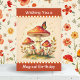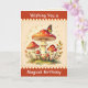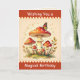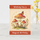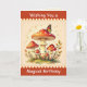 A birthday card for a friend with a picture of retro mushrooms in red and beige vintage colors and a Monarch butterfly. Inside is a whimsical poem and a cute frog holding a cupcake.