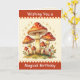 A birthday card with a picture of retro mushrooms in red and beige vintage colors. Inside is a whimsical poem and a cute frog holding a cupcake.