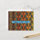 Vintage Retro-Muttertagskarte mit Pfauenfederdesign in warmen goldenen Tönen und Türkis.