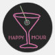 Das Retro-Design auf diesem Aufkleber, das wie ein Vintages Bar aussieht, ist mit einem neonfarbenen Pimento-gefüllten Olivenbaum auf einem Zahnstocher versehen, der in einem rosa Neonmartini-Glas schwebt. Mit einem Wort auf jeder Seite des Glasstamms wird der Satz "HAPPY HOUR" im offenen Text in demselben Rosa dargestellt. Der anpassbare Text kann leicht geändert werden, um zu sagen, was Sie wollen oder ganz gelöscht werden können. Aus meinem digital erstellten Original-Bild.