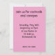 Gemacht, um wie ein Vintages Barzeichen auszusehen, kennzeichnet der retro Entwurf auf dieser Cocktail-Party Einladung eine Neon Piment-angefüllte Olive auf einem Toothpick, der in ein rosa Neonmartini-Glas schwimmt. Mit einem Wort auf jeder Seite des Glas' Stammes, wird die Phrase "GLÜCKLICHE STUNDE" heraus im offenen Text im gleichen Rosa buchstabiert. Der kundengerechte Text kann zum Anzug leicht geändert werden Ihr eigener Bedarf. Von meinem geschaffenen Bild der Vorlage digital.