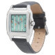 Eine Armbanduhr mit einer Darstellung von Birkenbäumen mit Orangenvögeln, die auf ihren Zweigen sitzen. Retro grüner Hintergrund.