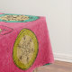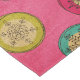 Ein wunderschönes, Vintages Ambiente mit rosa Tischdecke, mit vielen hübschen Senfschneeflocken, Aquablau und heiß rosa auf rosa Hintergrund.