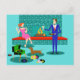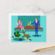 Dieses Retro-Paar mit Dog Postcard sieht aus wie eine Szene aus einer romantischen Komödie. Das minimalistische Design der 60er Jahre besticht durch ein ansprechendes Paar, das einen romantischen Abend bei der Zuhause genießt. Das elegante Zimmer besticht durch ein Aqua- und einen aquamarinen Backsteinkamin mit leuchtend rotem Kamin. Eine schöne, rötliche Frau, die ein helles, rosa Kleid trägt, steht auf der Spitze. Sie genießt einen Martini mit einem schwimmenden Oliven, einem rauschenden Feuer, guter Musik, und die Gesellschaft ein großer, dunkler und gut aussehender Mann. Der Mann trägt einen blauen Anzug und eine rote Krawatte. Sein Martini-Glas wird aufgezogen, um seinen bezaubernden Begleiter zu Toast. In seiner anderen Hand hält er ein Schallplattenalbum. An seinen Füßen sehen wir eine bezauberndste Dackel mit einem roten Kragen. Der spielerische Dackel-Hund läuft in Richtung eines grünen Plattenspielers mit orangefarbenen Spindelbeinen. Auf dem Boden gibt es eine bunte Gruppe von lustigen, eklektischen, Vinyl-Platten. Prost! Hier ist der perfekte Abend bei Zuhause.