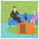 Dieses Retro Paar mit Katzen-Gewebe kennzeichnet ein Cartoonpaar, das versucht, cozy zu erhalten beim Fernsehen auf einer modernen Mitte des Jahrhunderts, blaues Sofa. Die Katze hat jedoch andere Ideen. Auf einer Seite des Sofas, gibt es einen hübschen Mann in einem schwarzen Anzug mit roter Krawatte. Auf der anderen Seite der stilvollen Couch, gibt es eine schöne, blonde Frau in einer Forminstallation, Pink ankleiden. Sachen würden groß gehen, wenn es nicht für die glatte schwarze Katze war, die Anspruch zum Mittelsofakissen gelegt hat. Diese Sechzigerjahre Art, unbedeutender Kunstentwurf ist Set in einem stilvollen Wohnzimmer. Der Hintergrund des Sofas ist ein Grün, Steinwand. Auf dem Aquaboden gibt es eine runde, grüne Noppewolldecke, die die Steinwand zusammenbringt. An der vordersten Reihe des Entwurfs, sehen wir die Rückseite eines orange FernsehSets mit den Kaninchenohren, das scheint, das Lieblings-Programm der Katze zu spielen Fernseh.