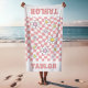 Multi Custom Color and Schriftart Style - personalisiertes Strandtuch mit Namen, Groovy, Daisies und Retro-Schachbrettmuster Hintergrund. Passen Sie alle Farben an, wie Sie möchten! Coole Idee für Bridesmaid Geschenk!