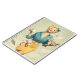 A stylish retro-inspired illustration of a confident woman balancing work and charm, depicted in classic pin-up fashion. Holding a coffee mug and a stack of papers, she radiates playful elegance amid flying documents. Soft pastel tones, bold lipstick, and vintage styling evoke mid-century glamour blended with modern empowerment.