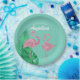 Diese individuellen Party-Teller sind mit einem Retro-Stil rosa Flamingo-Thema. Im unteren Teil befinden sich zwei Flamingos im Stil eines rosa Glitzer mit großen tropischen Palmen-Blätter auf den verlassen. Der Hintergrund ist wunderschön aquamarin, der Veranstaltungstitel und Ehrengast sind in einem Vintagen, weißen Schriftart gedruckt.