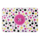Retro Pink Lila Monogramm Polka Dots Bath Mat. Ein lustiges und frisches Design mit verschiedenen Polka-Punkten in heißen Rosa, Perwinkle, Gelb und Schwarz auf weißem Hintergrund. Die Badematte mit Ihrem Monogramm und Namen personalisieren und Ihr Bad mit diesem bunten, fröhlichen Design wieder auffüllen. Es gibt auch einen passenden Duschvorhang.
