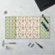 Die inspirierte Schreibtischmatte mit Whimsical Retro zeigt rosa Vögel auf den Zweigen mit gelben Blumen, umgeben von grünen Punktgittern