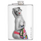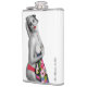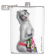 Nostalgische Pinup Girl Hip Flask mit originalen Pinup-Kunstwerken ©"Miss Cherrie Au Lait - Bath". Größeres Bild. Weißer Hintergrund.