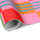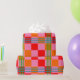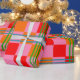 This wrapping paper has a mid-century modern design of red, pink, and orange squares and green and blue lines forming a plaid design.