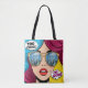 Unsere Retro Pop Art Tote Bag strotzt vor kühnen Farben und einem auffälligen Stil, mit einem auffallenden Design einer Frau mit blauen und rosa Haaren. Ihre Sonnenbrille reflektiert ein faszinierendes Stadtbild.