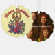Dieses farbenfrohe Retro-Design von Weihnachtsheiligen und Mistelen um eine Kerze und ein Friedenszeichen hat den Vintagen Groovy-Look der psychedelischen 60er und 70er Jahre. Sie können den Text ganz einfach personalisieren und das Foto auf der Rückseite mit Ihren eigenen ersetzen.