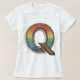 Dieses auffällige T - Shirt-Design zeichnet sich durch den Buchstaben "Q" aus, der mit einem lebhaften Regenbogenverlauf geschmückt ist. Der Buchstabe "Q" ist in einem Vintagen Stil mit einem schwarzen Rand dargestellt, und sein Körper ist mit horizontalen Streifen gefüllt, die durch ein Farbspektrum von Rot, Orange, Gelb, Grün, Blau bis lila übergehen. Der innere Teil des Buchstaben hat ein detailliertes Punktmuster, das dem Design Textur und Tiefe verleiht. Dieses Design verbindet eine Retro-Ästhetik mit einer modernen Drehung und macht es zu einer einzigartigen und stilvollen Ergänzung zu jedem Schrank.