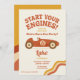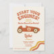Bereit, Set, Party! Dieses Retro Race Car zum Geburtstag lädt zu einem Traumurlaub für Ihren kleinen Speedster ein. Mit einem feinen 70er-Design mit Vintagen Schriftart, Sonnenuntergangsfarben und der lustigen Überschrift "Starten Sie Ihre Motoren!" ist diese Einladung ideal für Boho-, Retro- oder Wüstenfeiern.