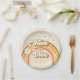 Neun ist ein Vibe! Retro inspirierte Teller zum 9. Geburtstag mit Schriftart und Farbtönen im Stil der 70er Jahre, Regenbogen und Gänseblümchen in Herbstfarben. Braun, braun und orange.