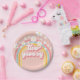 Zwei Groovy! Retro inspirierte Teller zum 2. Geburtstag mit Schriftart und Farben im Stil der 70er Jahre, Regenbogen und Gänseblümchen in Rosa