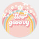 Zwei Groovy! Retro inspirierte 2. Geburtstagsticker mit Schriftart und Farben im Stil der 70er Jahre, Regenbogen und Gänseblümchen in Rosa
