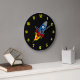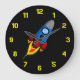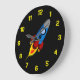 Rote und blaue Retrorakete mit grauem Nosecon und großer Porthole, gelbe und rote Flammen aus drei Jet-Motoren. Spaß und einzigartige Wanduhr!
