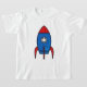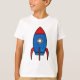 Cartoonrakete auf dem weißen T - Shirt eines Kindes. Auch verfügbar im Erwachsenen und Babygrößen und -arten.