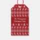 Ein altmodischer Weihnachtsbaum, Schneeflocke und Rentierfass-Raute-Pullover-Muster in Rot um Ihren personalisierten Text auf einem Feiertag Gunst-Tag, das einen Stricklook hat. Mit diesen nostalgischen, altmodischen Geschenketikern können Sie Ihren Urlaub individuell gestalten.