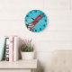 keep track of time in another dimension with this retro red rocket wall clock featuring a stunning outer space illustration and starry sky backdrop. the classic checkered tail and sleek red fuselage make this timepiece a perfect addition to a kids nursery or a science fiction themed office. this functional piece of decor captures the excitement of a galactic voyage and the beauty of a celestial background in every second that passes. transform any room into a center for exploration with this unique vintage blast off graphic that combines practical utility with stellar artistic style.