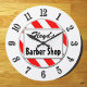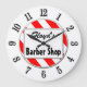 Eine einzigartige Wanduhr, die Barber Shop in Blockbuchstaben liest, mit Platz für Ihren Namen in Retro-Skript auf einem rot-weiß gestreiften Hintergrund, umgeben von schwarzen Buchstaben auf einem weißen Gesicht. Klicken Sie auf Anpassen, um die Schriftart, die Größe, die Hintergrundfarben und vieles mehr zu ändern, und rettete Sie Ihr Design für später.