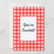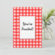 Benutzerdefinierte Geburtstagsfeiereinladungen mit Retro-Skriptbriefen und einem rot-weiß karierten Muster.