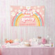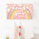 Vier je Groovy! Retro inspiriert Banner zum 4. Geburtstag mit Schriftart und Farben im Stil der 70er Jahre, Regenbogen und Gänsebläschen in Rosa