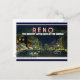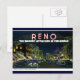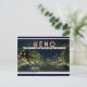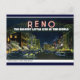 Vintage Postkartendarstellung von Reno in der Nacht. Farbige Lichter und alte Autos mit einem rosa Neonengraben Schriftart "Reno" oben mit "Die größte kleine Stadt der Welt" in Weiß unten. Es ist eine Szene aus der Virginia Street in Reno.