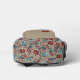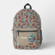 Die Vordertasche dieses Rucksacks ist bereit, mit einem Namen oder Initialen personalisiert zu werden. Es zeigt eine niedliche Abbildung eines Retro-Roboters in hellblau vor einem bräunlichen Hintergrund. Die Erholung des Rucksacks hat ein rotes und blaues Robotermuster und koordiniert die Hex-Nüsse vor einem bräunlichen Hintergrund.
