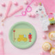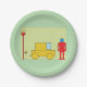 Ein Retro-Roboter, der neben einem Gelbwagen stehend ist. Dieses Design wirkt bei diesen Paper-Tellern sehr effektiv