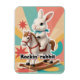 A card for numerous occasions. A white rabbit rides upon a nursery wooden rocking horse.