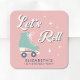 Niedlicher Rosa Aufkleber für ihre Roller-Skaten Geburtstagsparty mit "Let's Roll" in einem lustigen 70er-Jahre-Stil-Drehbuch und einer Retro-inspiriert Abbildung eines aquamarinen blauen Roller-Skate. Personalisieren Sie mit ihrem Namen in aquamariner dunkelblauer Typografie.