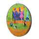 Dieses Retro Romantic Abend Couple Dart Board sieht aus wie eine Szene aus einer romantischen Comedy aus den 1960er Jahren. Das minimalistische Design bietet ein attraktives Cartoon-Paar im Wohnzimmer eines modernen, urbanen Apartments aus der Mitte des Jahrhunderts. Der Raum ist mit einer grünen Steinwand versehen, die von einer Decke bis zum Boden reicht und einen Ausblick bietet. Durch das Fenster können wir die blaue Silhouette einer großen City-Skyline sehen. Ein Halbmond ist nur im orangen Himmel des Sonnenuntergangs zu sehen. Die Einrichtung des Zimmers umfasst einen grünen Sitzstuhl mit passendem Fußhocker, eine gelbe, sputnikfarbene Leuchte sowie einen türkisfarbenen, konischen Kamin, der mit einem Brand versehen ist. In der Mitte des orangefarbenen Bodens befindet sich ein runder, grüner Teppich. Auf dem Teppich befindet sich ein tragbarer, türkisfarbener und schwarzer Plattenspieler. Neben dem Plattenspieler kann man eine Schallplatte aus einem kitschigen Albumcover sehen. Auch auf dem Teppich befindet sich eine schwarze, schlanke Katze, die einen aquamarinen Kragen trägt. Diese extravagante Katze sitzt vor einem Martini-Glas. In dieser Szene haben wir ein sehr raffiniertes Paar. Es gibt einen suave Mann mit einem blauen Anzug, hellblauem Shirt und roter Krawatte. Der große, dunkle und gut aussehende Mann genießt die Begleitung einer eleganten Blondine. Die hübsche Dame trägt ein heißes rosa Kleid mit einem formschönen Bodice und einem geschmackvollen Rock. Sie besitzen jeweils ein Kristallmartini-Glas mit schwimmendem Olivenöl. Prost! Hier zum perfekten Abend bei Zuhause!