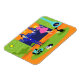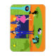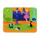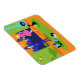 Dieses Retro Romantic Abend Couple Flexible Magnet sieht aus wie eine Szene aus einer romantischen Comedy aus den 1960er Jahren. Das minimalistische Design bietet ein attraktives Cartoon-Paar im Wohnzimmer eines modernen, urbanen Apartments aus der Mitte des Jahrhunderts. Der Raum ist mit einer grünen Steinwand versehen, die von einer Decke bis zum Boden reicht und einen Ausblick bietet. Durch das Fenster können wir die blaue Silhouette einer großen City-Skyline sehen. Ein Halbmond ist nur im orangen Himmel des Sonnenuntergangs zu sehen. Die Einrichtung des Zimmers umfasst einen grünen Sitzstuhl mit passendem Fußhocker, eine gelbe, sputnikfarbene Leuchte sowie einen türkisfarbenen, konischen Kamin, der mit einem Brand versehen ist. In der Mitte des orangefarbenen Bodens befindet sich ein runder, grüner Teppich. Auf dem Teppich befindet sich ein tragbarer, türkisfarbener und schwarzer Plattenspieler. Neben dem Plattenspieler kann man eine Schallplatte aus einem kitschigen Albumcover sehen. Auch auf dem Teppich befindet sich eine schwarze, schlanke Katze, die einen aquamarinen Kragen trägt. Diese extravagante Katze sitzt vor einem Martini-Glas. In dieser Szene haben wir ein sehr raffiniertes Paar. Es gibt einen suave Mann mit einem blauen Anzug, hellblauem Shirt und roter Krawatte. Der große, dunkle und gut aussehende Mann genießt die Begleitung einer eleganten Blondine. Die hübsche Dame trägt ein heißes rosa Kleid mit einem formschönen Bodice und einem geschmackvollen Rock. Sie besitzen jeweils ein Kristallmartini-Glas mit schwimmendem Olivenöl. Prost! Hier zum perfekten Abend bei Zuhause!