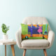 Dieses Retro Romantic Abend Couple Lumbar Kissen sieht aus wie eine Szene aus einer romantischen Comedy aus den 1960er Jahren. Das minimalistische Design bietet ein attraktives Cartoon-Paar im Wohnzimmer eines modernen, urbanen Apartments aus der Mitte des Jahrhunderts. Der Raum ist mit einer grünen Steinwand versehen, die von einer Decke bis zum Boden reicht und einen Ausblick bietet. Durch das Fenster können wir die blaue Silhouette einer großen City-Skyline sehen. Ein Halbmond ist nur im orangen Himmel des Sonnenuntergangs zu sehen. Die Einrichtung des Zimmers umfasst einen grünen Sitzstuhl mit passendem Fußhocker, eine gelbe, sputnikfarbene Leuchte sowie einen türkisfarbenen, konischen Kamin, der mit einem Brand versehen ist. In der Mitte des orangefarbenen Bodens befindet sich ein runder, grüner Teppich. Auf dem Teppich befindet sich ein tragbarer, türkisfarbener und schwarzer Plattenspieler. Neben dem Plattenspieler kann man eine Schallplatte aus einem kitschigen Albumcover sehen. Auch auf dem Teppich befindet sich eine schwarze, schlanke Katze, die einen aquamarinen Kragen trägt. Diese extravagante Katze sitzt vor einem Martini-Glas. In dieser Szene haben wir ein sehr raffiniertes Paar. Es gibt einen suave Mann mit einem blauen Anzug, hellblauem Shirt und roter Krawatte. Der große, dunkle und gut aussehende Mann genießt die Begleitung einer eleganten Blondine. Die hübsche Dame trägt ein heißes rosa Kleid mit einem formschönen Bodice und einem geschmackvollen Rock. Sie besitzen jeweils ein Kristallmartini-Glas mit schwimmendem Olivenöl. Auf der gegenüberliegenden Seite dieses Kissens befindet sich ein grünes, steinernes Muster. Prost! Hier zum perfekten Abend bei Zuhause!