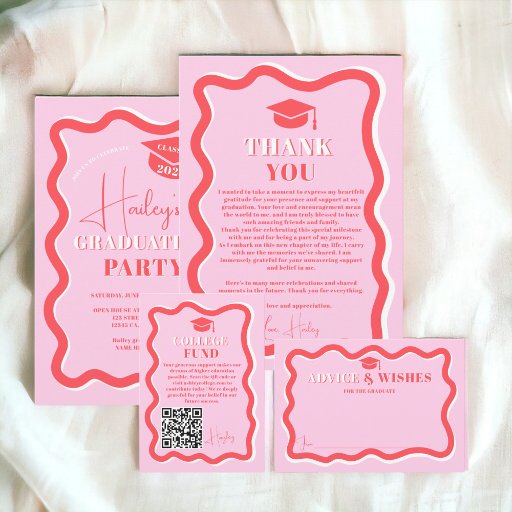 Eine coole Abschluss-Ankündigung mit Retro rosa rote Kurve quiggle wavy Foto. Alle Texte, Namen und Hintergrundfarben sind anpassbar.