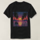 A small futuristic rover pauses on a reflective grid shore, looking out at a striped golden sun setting behind distant mountains and leaning palms. The starry evening sky and shimmering water give this scene a peaceful sci-fi vacation vibe. Ideal for space lovers and fans of nostalgic synthwave landscapes.