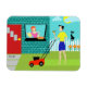 Willkommen in Suburbia! Dieses Retro Saturday Morning Flexi Magnet besticht durch ein attraktives, minimalistisches Cartoon-Paar in der kleinen Ecke des Paradieses. Aus dem Fenster eines türkisfarbenen und aquamarinen Ziegelhauses sehen wir Frau Homemaker. Die schöne Rothöhe trägt einen heißen rosa Fröck. Sie hält einen Krug frisch gepresster Limonade in einer Hand. Auf dem Fensterbrett vor ihr gibt es eine Rohrleitung heiß, hausgemacht, Gitterbettdecke, Obstkuchen in einem grünen Kuchen Teller. Auf dem Weg, vor der roten Tür zur Zuhause, wird die am Samstag vormittag aufgerollte Zeitung gewartet, um gelesen zu werden. Herr Mann des Hauses ist auf dem üppig grünen Rasen stehend. Er trägt eine blaue Hose und ein gelbes Shirt, das zu der sonnigen Haltung seiner Ehefrau passt. Er ist hinter einem roten Rasenmäher stehend. Wir können sehen, dass er bereits einen Grasstreifen gemäht hat, aber an diesem Punkt ist es schwer zu sagen, ob er hart arbeitet oder kaum arbeitet. Der Mähen scheint still zu sein, während er ein wackeliges Glas Limonade genießt. Ah, erfrischend! Neben dem Haus steht der Familienfeline auf einem weißen Zaun. Snowball, die ironisch schwarze Katze, schaut auf ihre treuen Subjekte und die orangen und gelben Blumen, die die Zaunreihe umranden. Die gelbe Sonne pinkelt hinter flauschigen, hellblauen Wolken. Der Himmel ist der Schatten des Wassers für Heimat, USA in kitschigen, modernen Kunstwerken Mitte des Jahrhunderts reserviert.